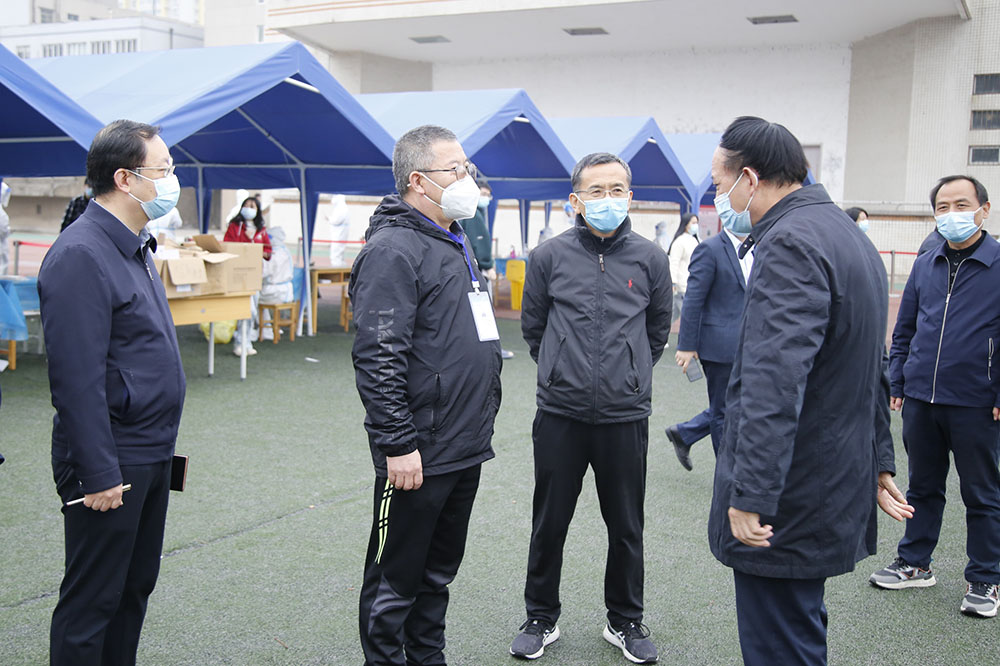 李校長一行到鄠邑校區東門口、核酸檢測點、食堂、宿舍等場所,實地查看了全員核酸、門禁管理,食堂就餐、出入宿舍等各項疫情防控規定要求的落實情況,并現場聽取相關部門的工作匯報。隨后,李校長通過座談的方式聽取了學生工作部(處)、教務處、地球科學與工程學院、人文學院等部門在學校封閉管理期間的疫情防控、教學和學生管理等方面工作的開展情況。