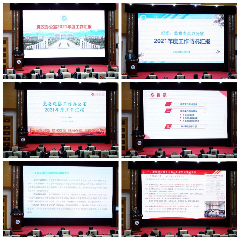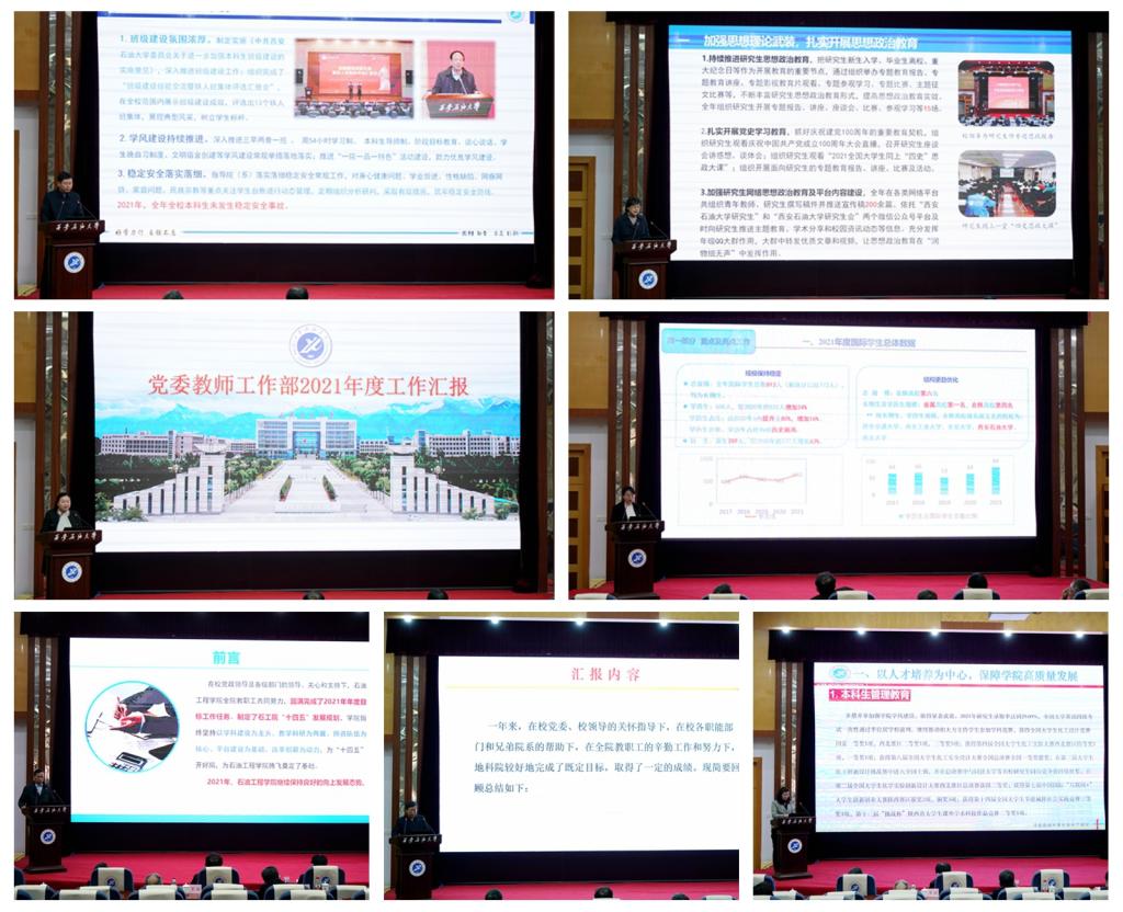 會上,全校各機關教輔單位主要負責人結合部門崗位職責和年度工作要點完成情況進行了匯報。各院(系)主要負責人重點圍繞黨的建設、學科專業、教學科研、學生工作等方面進行了匯報。匯報過程中,各單位對照主要工作指標,匯報了近三年工作增量情況,同時,對工作中存在的問題和不足進行了分析,并明確提出了2022年的工作思路和努力方向。各單位述職述廉匯報準備充分,內容詳實,重點突出,充分展示了各單位在2021年取得的成績。