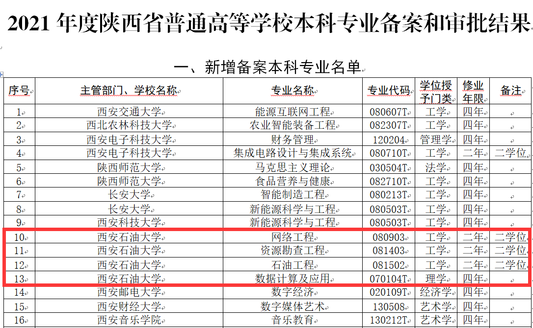 近日,教育部發布了《關于公布2021年度普通高等學校本科專業備案和審批結果的通知》(教高函〔2021〕14號)。根據公布結果,我校2021年新增獲批數據計算及應用1個本科專業,新增獲批網絡工程、資源勘查工程、石油工程3個第二學士學位專業。至此,我?,F有本科專業58個,涵蓋理、工、經、管、文、教、藝七個學科門類,專業布局日趨合理,專業特色更加明顯,專業優勢不斷凸顯。