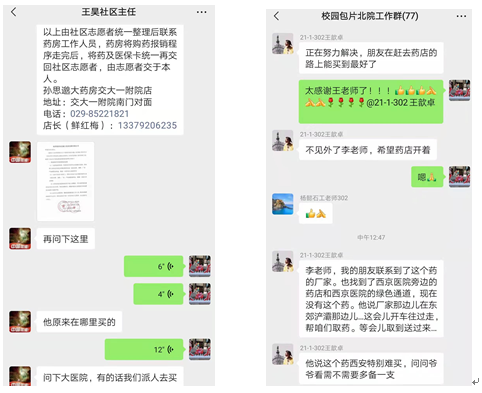 該樓樓長李建偉老師看到信息后立馬聯系校醫院,在得知校醫院沒有該藥物后又和怡康、眾信、孫思邈等六七家藥店打電話咨詢,還是都沒有該藥品,于是聯系長延堡救治組,獲得交大一附院、省康復醫院、五二一醫院等幾家醫院聯系方式,仍未能得到藥品的情況下,李老師在石油大學北院包片工作群中發出求助信息。北院包片負責人、各樓長、單元長、社區主任、校醫院等各位老師積極行動起來,每個人都發揮自己的各種渠道力量進行愛心求助。最終北院21號樓單元長王歆卓老師聯系到蓮湖區和碑林區防疫保障組的朋友鄭海龍老師,鄭老師先是跑到胃癌老人做手術的西京醫院和老人之前買過藥的藥店,在被告知都沒有該藥的情況下,他聯系到了該藥在西安的代理商,最終在東郊浐灞買到了該藥,然后又穿越整個西安以最快的速度送到石油大學社區北院,解決了燃眉之急。