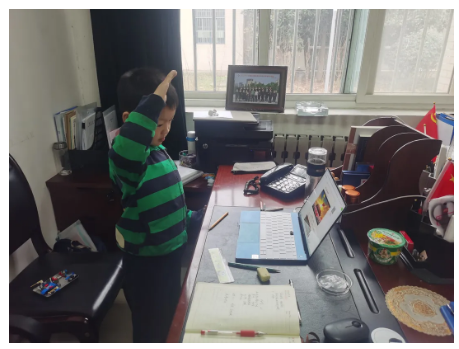 劉念喆在爸爸辦公室通過網課參加新年升旗典禮