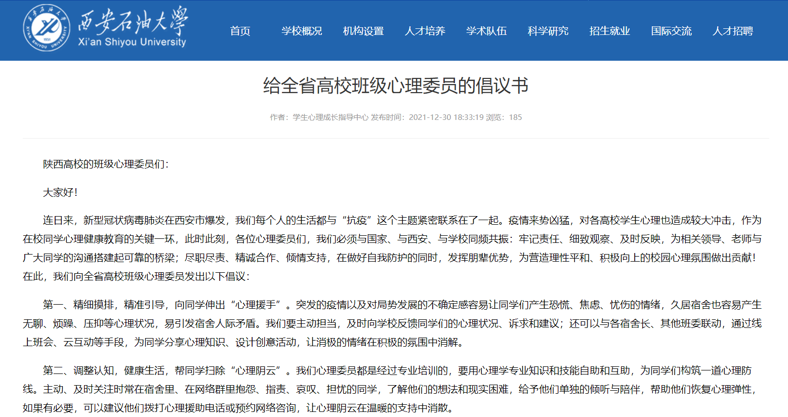 自12月16日學校黨委安排部署疫情防控工作以來,黨委學生工作部、研究生工作部密切聯動,各院(系)黨委(總支)積極配合,迅速啟動學生工作干部24小時在崗、鄠邑校區每周輪值等工作制度,確保一線工作力量充足,全方位有序做好思想教育引導、政策法律宣傳、衛生防疫知識學習等工作。