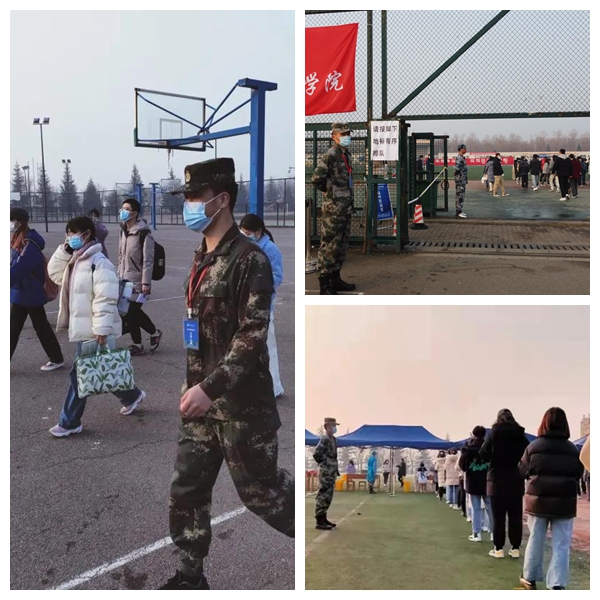 考研臨近,我校為考研學子提供了核酸檢測服務。通知發出后,退伍大學生分隊再次集結,主動請求為考研學子服務。在我校鄠邑校區西操場的核酸檢測現場,他們身著綠色軍裝的身影格外醒目,他們中有的人拿著小喇叭,不斷向等候檢測的隊伍發出溫馨提示;有的人穿著厚厚的防護服,在為前來檢測的人員做信息登記;有的人在各個區域組織人員分流、有序入場。