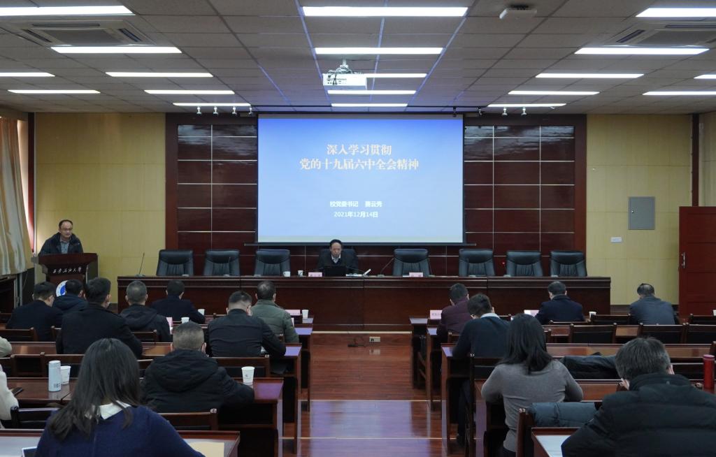 12月14日下午,我校學習貫徹黨的十九屆六中全會精神宣講會在雁塔校區會議中心第五會議室舉行,校黨委書記賽云秀進行專題宣講。黨委各部(辦)、工會、團委等部門負責人,機關、教輔各單位綜合業務科室負責人及各院(系)綜合辦公室主任參加了宣講會。