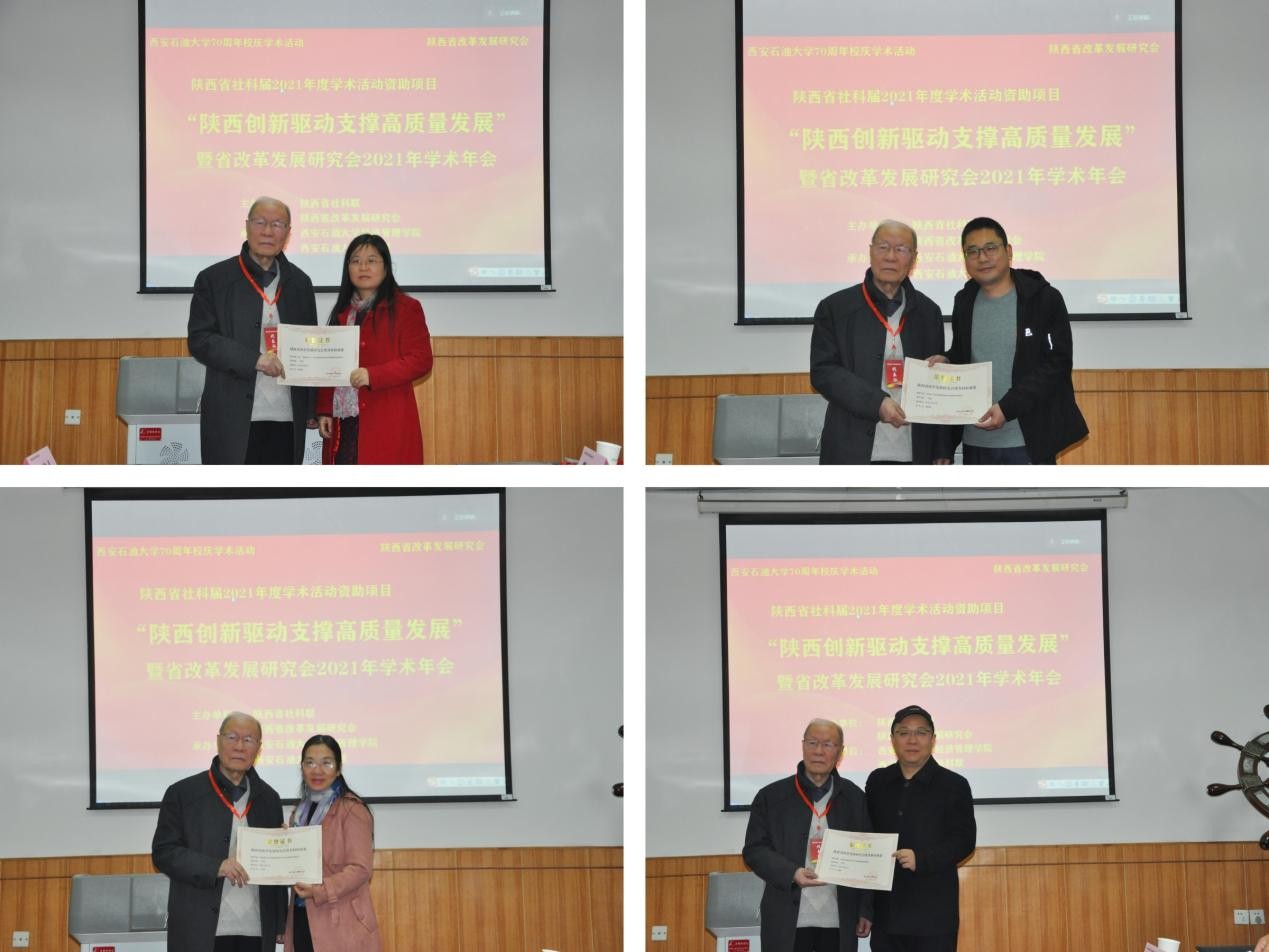 享受國務院特殊津貼專家、陜西省有突出貢獻專家、陜西經貿學院原院長、西安財經大學樊光鼎教授對陜西省改革發展研究會慶祝建黨100周年優秀科研成果評獎活動進行了介紹,并宣讀獲獎文件,與獲獎代表合影留念。