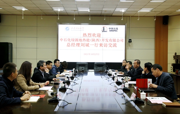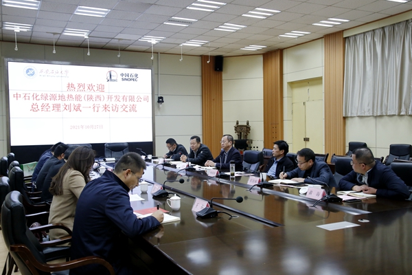 10月27日上午,中石化綠源地熱能(陜西)開發有限公司總經理劉斌一行6人來校交流座談。會議在雁塔校區會議中心第二會議室召開。副校長楊戰社出席會議,科技處、基建處、后勤管理處和石油工程學院負責人參加了會議。副校長張榮軍主持會議。