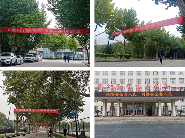 安全周期間,學校在雁塔校區和鄠邑校區主干道懸掛了網絡安全宣傳周宣傳條幅,在LED大屏上輪播宣傳標語,并在門戶網站添加了網絡安全宣傳周宣傳大圖,加強網絡安全宣傳力度,營造網絡安全宣傳教育氛圍。