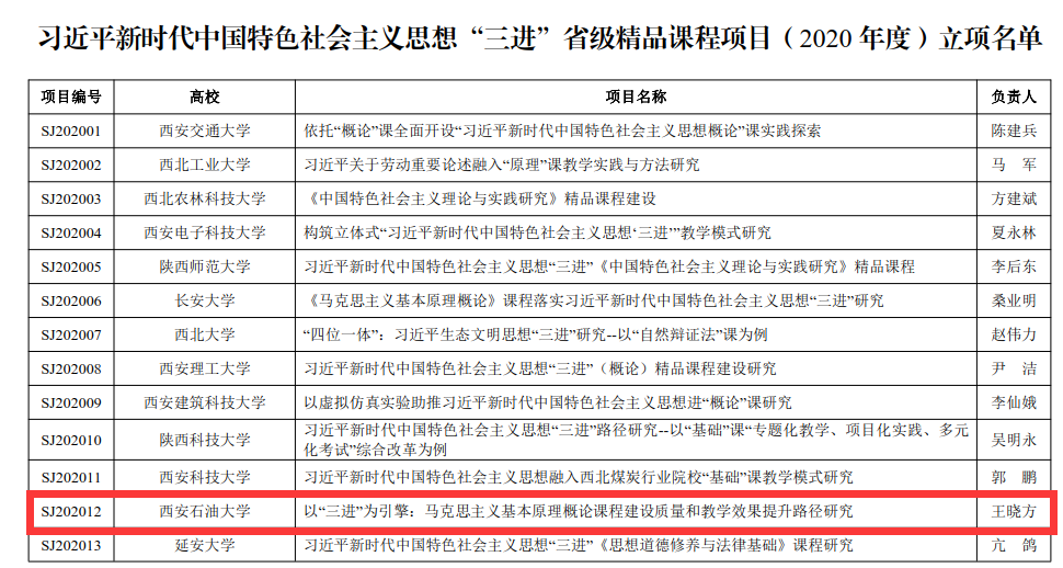 近日,省委教育工委發布了《中共陜西省委教育工委關于習近平新時代中國特色社會主義思想“三進”省級精品課程項目(2020 年度)立項的通知》,全省共有25項課程項目予以立項。我校馬克思主義學院王曉方教授申報的《以“三進”為引擎:馬克思主義基本原理概論課程建設質量和教學效果提升路徑研究》入選立項名單。