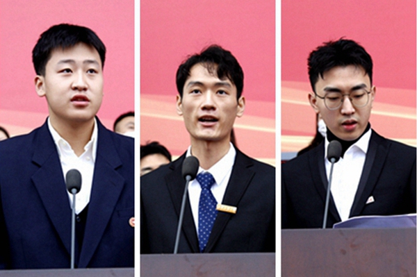 地球科學與工程學院物探2101班王振宇同學代表全體本科新生發言,石油工程學院2021級博士研究生趙一凡同學代表全體研究生新生發言,機械工程學院2019級碩士研究生李羿瑭同學代表全體在校學生發言。