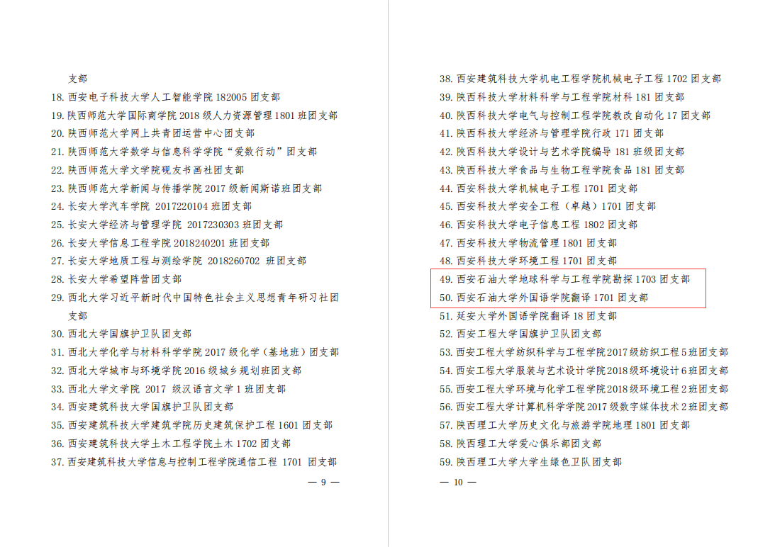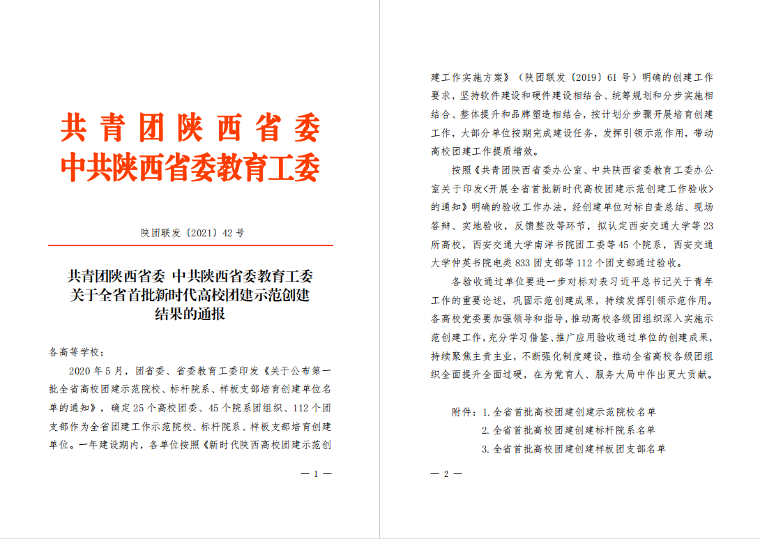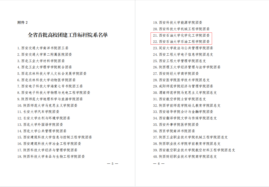 近日,共青團陜西省委、中共陜西省委教育工委公布了《關于全省首批新時代高校團建示范創建結果的通報》,我校石油工程學院團委、化學化工學院團委通過“全省高校團建標桿院系”驗收,地球科學與工程學院勘探1703團支部、外國語學院翻譯1701團支部通過“全省高校團建樣板支部”驗收。