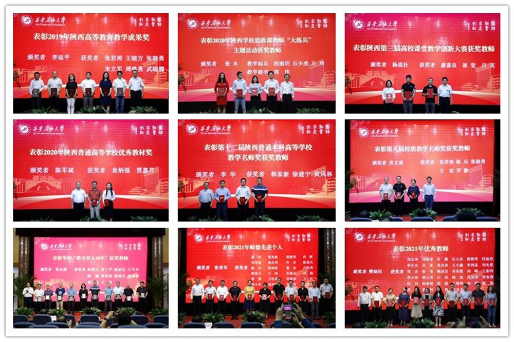 會上,校黨委書記賽云秀宣讀了《陜西省總工會關于表彰2020年陜西省五一勞動獎和陜西省工人先鋒號的決定》,并為五一勞動獎章獲得者周靜老師頒獎;校長李天太宣讀了《陜西省人力資源和社會保障廳關于我省 2020 年享受政府特殊津貼人員的通知》,并為入選者周德勝老師頒獎;校黨委副書記、紀委書記、監察專員李延平宣讀了《陜西省人民政府辦公廳關于表彰2019年高等教育教學成果獎獲獎項目的通報》,并為張君濤、王曉方、張驍勇、宋立軍、周鳴勇、武曉朦6位老師領獎;校黨委副書記張木宣讀了《中共陜西省委教育工委陜西省教育廳關于表彰2020年陜西學校思政課教師“大練兵”主題活動獲獎教師的決定》,并為程麗玥、石少虎、左玲、鄭偉4位老師領獎;副校長楊戰社宣讀了《陜西省教育廳關于表彰陜西第三屆高校課堂教學創新大賽獲獎教師的決定》,并為廖嘉良、崔瑩、呂英3位老師頒獎;副校長陳軍斌宣讀了《陜西省教育廳辦公室關于公布2020年陜西普通高等學校優秀教材獲獎名單的通知》,并為袁炳強、賈惠芹2位老師頒獎;副校長李華宣讀了《陜西省教育廳關于表彰第十二屆陜西普通本科高等學校教學名師獎獲獎教師的通知》,并為韓家新、徐建寧、黃風林3位老師頒獎;副校長蘇文甫宣讀了《西安石油大學關于公布第八屆校級教學名師獎評選結果的通知》,并為獲獎老師頒獎;副校長程永清宣讀了《西安石油大學關于表彰獎勵“教書育人30年”教師的決定》,并為張群正、周三平、楊愛民、王可升、陳楠、鐘澤波 、郝建東、高永利、黃風林、王嵐等10位老師頒獎;副校長張榮軍宣讀了《中共西安石油大學委員會 西安石油大學關于表彰2021年師德建設先進集體和師德先進個人的決定》,并為獲獎單位和先進個人代表頒獎;總會計師樊曉民宣讀了《中共西安石油大學委員會 西安石油大學關于表彰2021年優秀教師 先進教育工作者的決定》,并為獲獎教師代表頒獎。