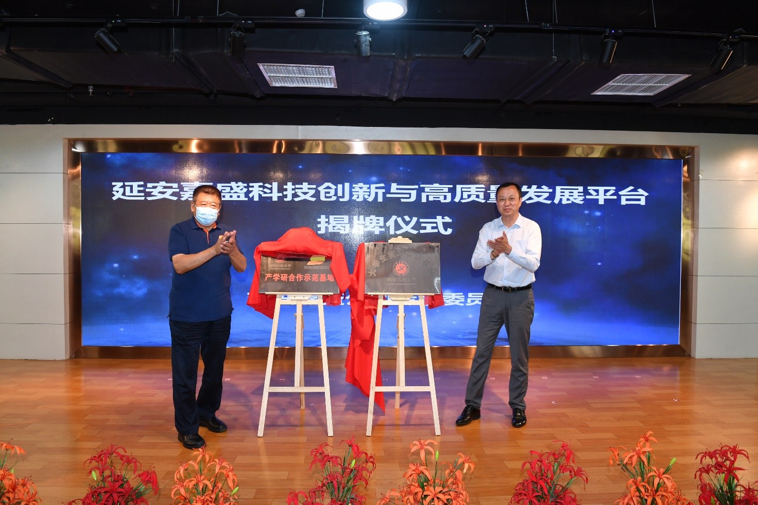 會上,副校長張榮軍與延安嘉盛公司董事長蘇忠貴代表雙方簽署校企合作協議,并為“產學研合作示范基地”和“大學生實習實訓基地”揭牌。
