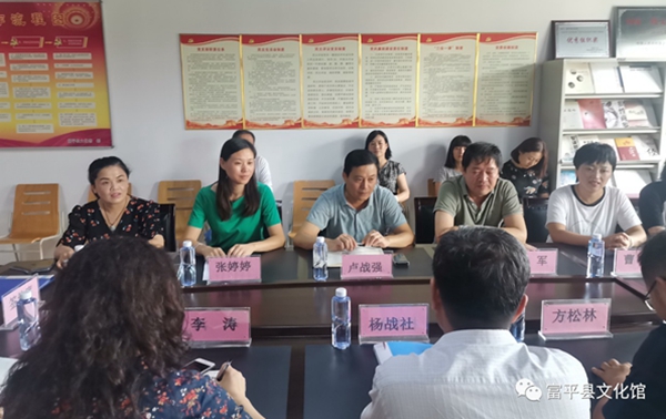 在富平縣文化館,楊戰社副校長一行與富平縣文化和旅游局局長盧戰強、副書記吳軍、副局長文化館館長張婷婷等就紅色文化的傳承與傳播、區域文化特色的凝練進行了座談,然后一起參加了實踐基地揭牌儀式。盧戰強局長介紹了富平縣文化和旅游產業的發展現狀。他說,富平縣的人文資源豐富、文化遺產眾多,紅色文化資源也十分豐富,希望能夠與高校結對交流合作,發揮西安石油大學人才優勢,就富平縣的非物質文化傳承創新深化合作。吳軍副書記表示將以本次活動為契機,在文旅融合、人才培養、學生實習實踐等方面繼續與西安石油大學深度合作,進一步加強溝通交流。