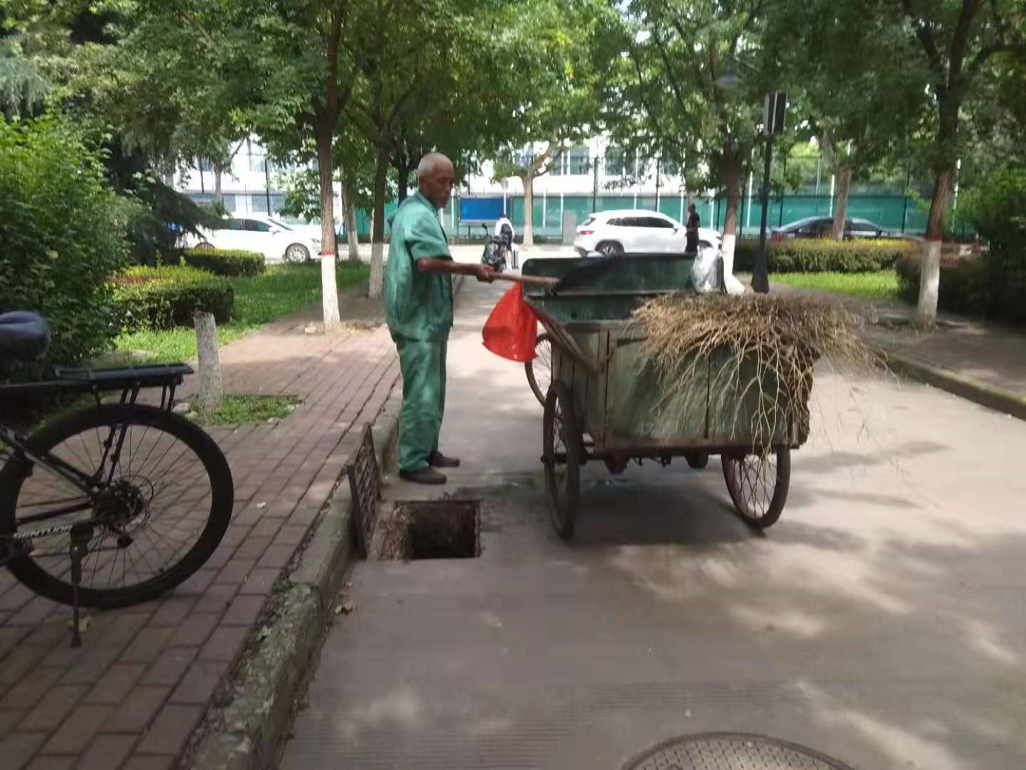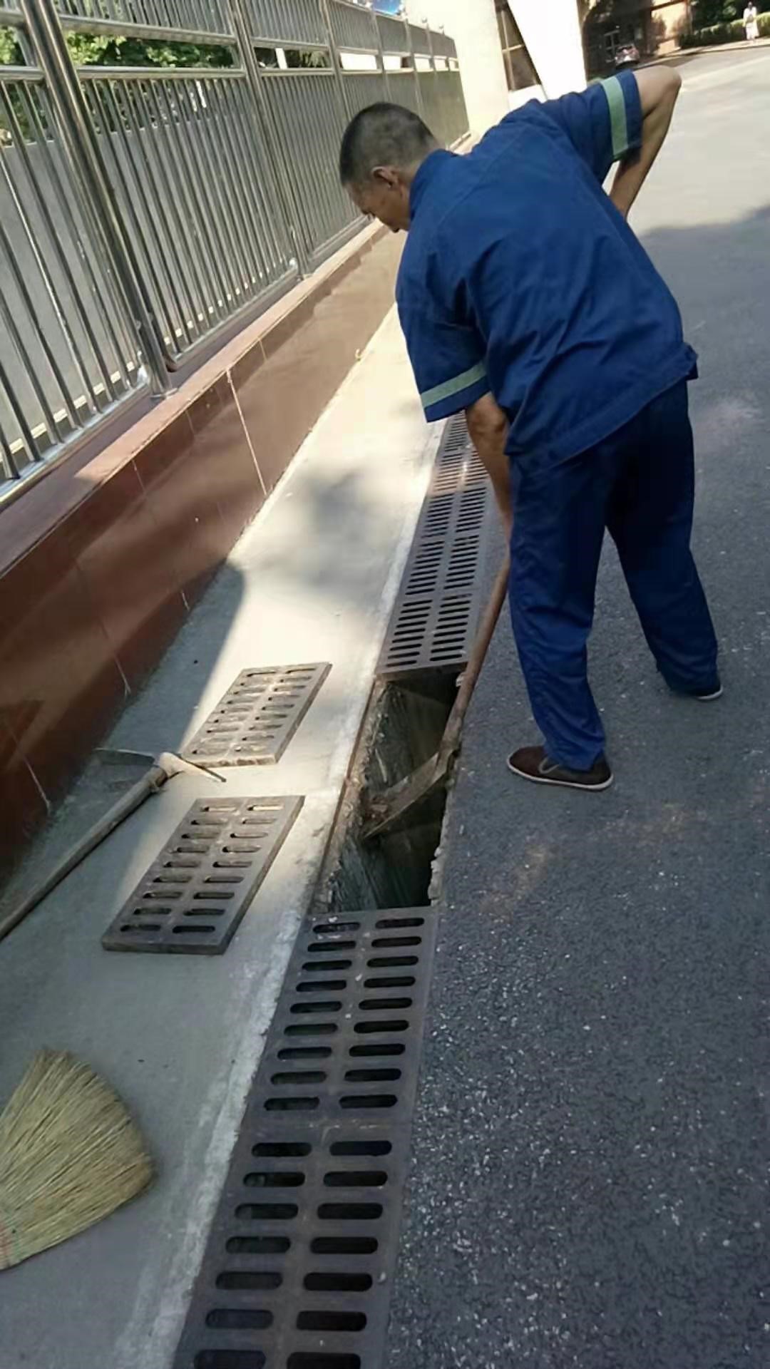 物業工作人員清理校園雨水收水井和排水溝內雜物