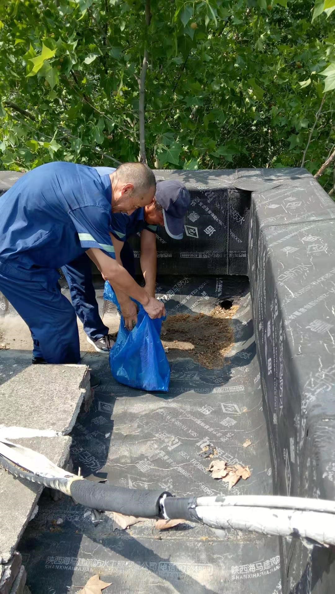 工作人員清理雁塔校區住宅樓樓頂雨水排水管口