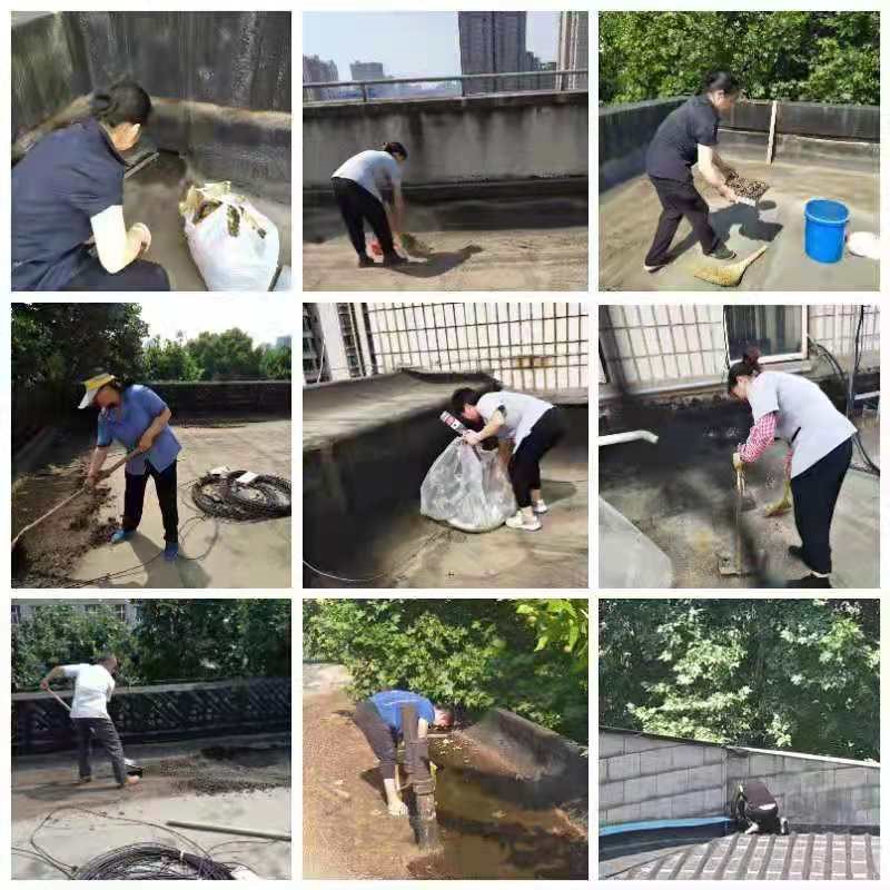 工作人員在各樓宇樓頂屋面、排水(落水)管口進行雜物清掏