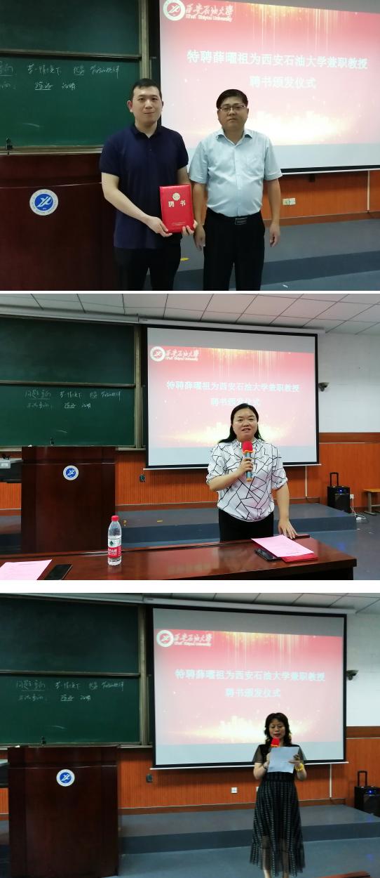 7月1日,特聘薛曜祖為西安石油大學兼職教授聘書頒發儀式在我校雁塔校區東階201教室舉行。學??倳嫀煼畷悦?,經濟管理學院相關負責人及師生代表80余人參會,聘書頒發儀式由教師工作部部長武曉朦主持。