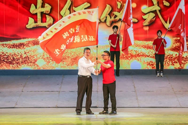 出征儀式上,我校地球科學與工程學院2021屆資源勘查工程專業本科畢業生畢昆作為赴青海省基層就業畢業生代表,接受方光華副省長授旗(經畢昆授權代領)。