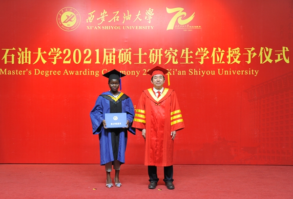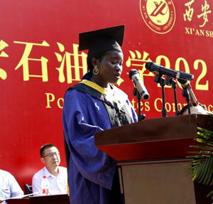 地球科學與工程學院高棒棒和石油工程學院來自加蓬共和國的歐碧麗同學,分別代表2021屆碩士研究生和碩士留學生在發言中向悉心培育自己的母校、師長和親人表示感謝,同時表達了自身繼續努力、續寫輝煌的信心和決心。