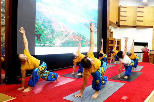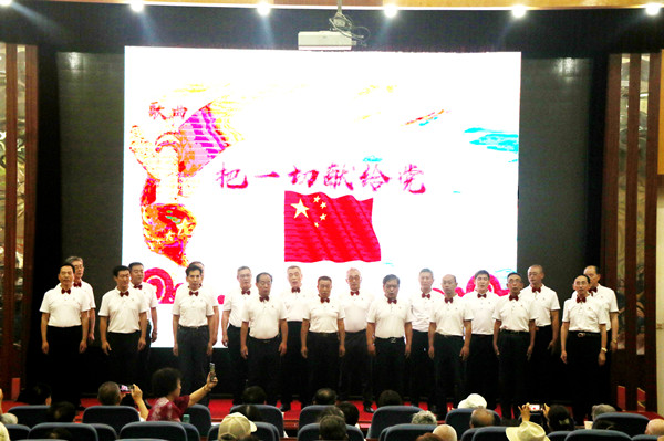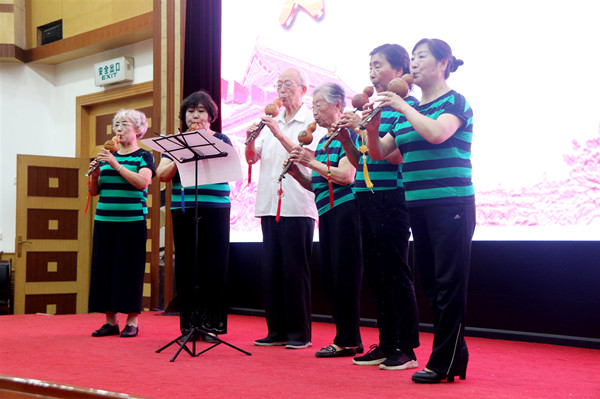 之后,老年大學的學員們和離退休教職工為大家帶來了精彩的文藝節目。演出在開場舞《唱支山歌給黨聽》中拉開了帷幕。老年大學女子合唱隊帶來的女聲小合唱《沒有共產黨就沒有新中國》《中國一定強》,合唱團男生小合唱《把一切獻給黨》,合唱團女生小合唱《洪湖浪花》《天使的聲音》,葫蘆絲樂團的聯奏《紅歌聯奏》等節目,充分展示了老年大學的教學成果和老同志熱愛黨、熱愛生活的良好精神面貌。黃放明老師京劇清唱《朝霞映在陽澄湖上》,老年大學瑜伽協會帶來的瑜伽表演《人間第一情》、馮原、漢澤西等老同志帶來的詩詞朗誦《人民萬歲》《西石大賦》,展示了離退休教職工的多才多藝。文藝演出最后,我校原校長張寧生教授領唱,老年大學合唱團60多名團員共同演唱的《不忘初心》《我家在中國》,將老同志、老黨員對偉大祖國的熱愛匯集成流淌的歌聲,祝福偉大的祖國繁榮昌盛,祝福偉大的黨永遠不忘初心,將現場氣氛引向高潮。