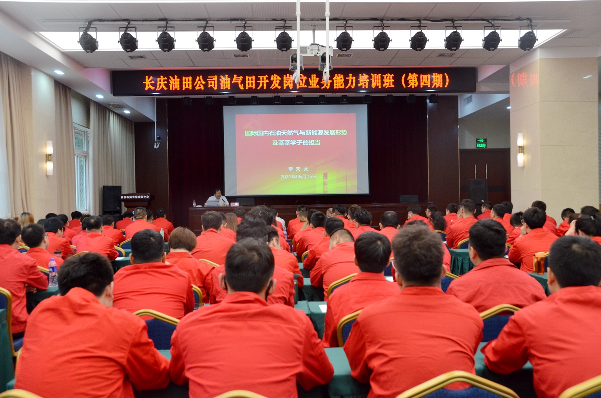 6月15日上午,校長李天太教授應邀在我校明德校區為長慶油田公司2021年油氣田開發技術崗位能力培訓班全體學員作了題為《國際國內石油天然氣與新能源發展形勢及莘莘學子的擔當》的專題報告,繼續教育學院黨總支書記耿嶺主持報告會。