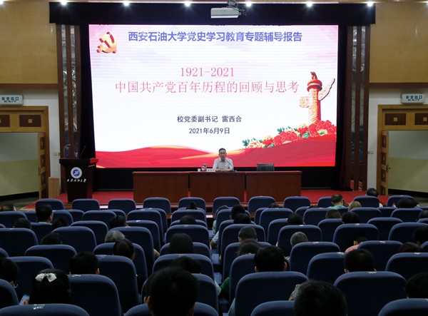 6月9日上午,校黨委副書記雷西合在雁塔校區學術報告廳作了題為《中國共產黨百年歷程的回顧與思考》黨史學習教育專題輔導報告。學校各民主黨派成員、無黨派人士、機關黨委黨員230余人參加了報告會。報告會由校黨委委員、統戰部部長、機關黨委書記吳復雷主持。