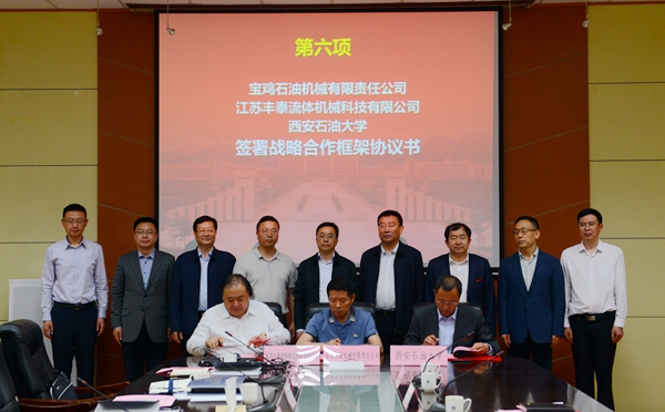 會上,寶雞石油機械有限責任公司副總經理張斌、江蘇豐泰流體機械科技有限公司董事長侯曉東、我校副校長張榮軍分別代表校企政三方簽署了戰略合作協議書,我校材料科學與工程學院院長張驍勇、江蘇蓮源機械制造有限公司副總經理陳玉洪分別代表校企雙方簽署了技術服務合同。政企校三方科技部門、我校相關院系負責人就三方今后在石油機械領域科研合作、人才培養等方面的合作進行了深入探討。