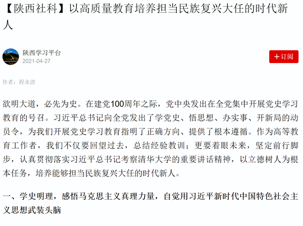 4月27日,“學習強國”陜西學習平臺刊發我校程永清副校長《以高質量教育培養擔當民族復興大任的時代新人》的文章,文章以學史明理,感悟馬克思主義真理力量,自覺用習近平新時代中國特色社會主義思想武裝頭腦;學史增信,堅定共產主義信仰,發揮中國特色社會主義制度優勢,始終做到“兩個維護”;學史崇德,堅持教書育人,傳播和弘揚社會主義核心價值觀;學史力行,深化人才培養模式改革,推動高等教育高質量發展等四個方面進行闡述。