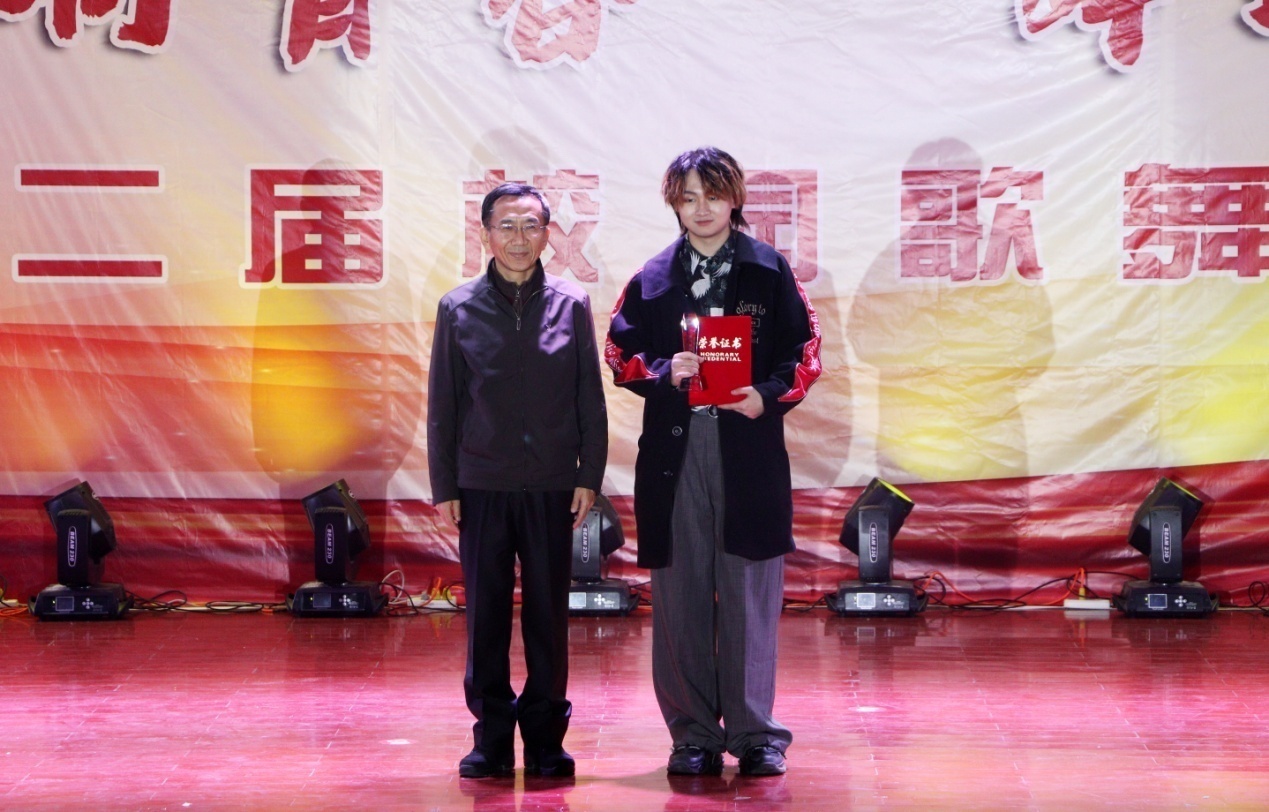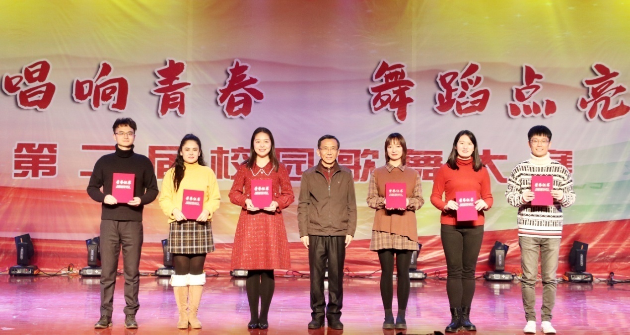 最終,經過激烈角逐,《給你一點顏色》獲歌曲組一等獎,《New York New York》《黑貓警長》獲歌曲組二等獎,《鴻雁》《故鄉山川》《易燃易爆炸》獲歌曲組三等獎,《少年錦時》《古風歌曲串燒》《錯》《飛云之下》獲歌曲組優秀獎;強波蓉、萊麗古麗·伊立哈木獲舞蹈組一等獎,胡容榕、卡比熱阿·比那爾別克獲舞蹈組二等獎,孜拉來·阿不地力木、娜迪熱·阿樸杜外力、邵鏝毅獲舞蹈組三等獎,沈安媞、王一平、王馨蔚、楊怡飛、李蔚然獲舞蹈組優秀獎;古蘭、邱迪、范嘉欣、張靚、沈軒羽、史陽獲優秀導師獎。張木副書記為獲獎師生頒獎。