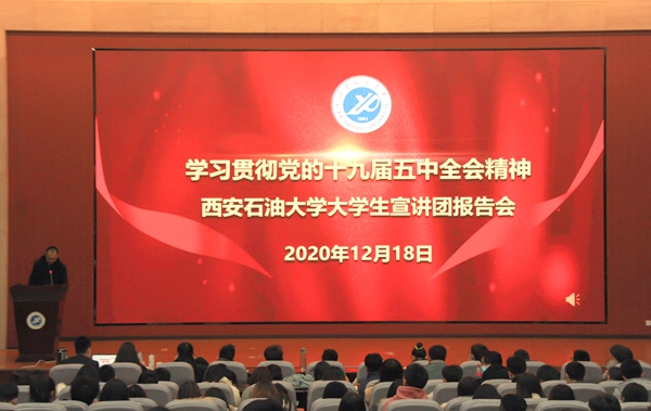 為學習宣傳貫徹黨的十九屆五中全會精神,推動全會精神入腦入心,按照省委教育工委、省教育廳的相關安排,我校成立了貫徹黨的十九屆五中全會精神大學生宣講團。12月18日下午,宣講團同時在鄠邑校區弘石報告廳、雁塔校區第五會議室開講。校黨委副書記雷西合,黨委宣傳部、馬克思主義學院負責人,500余名研究生、本科生參加了宣講會。