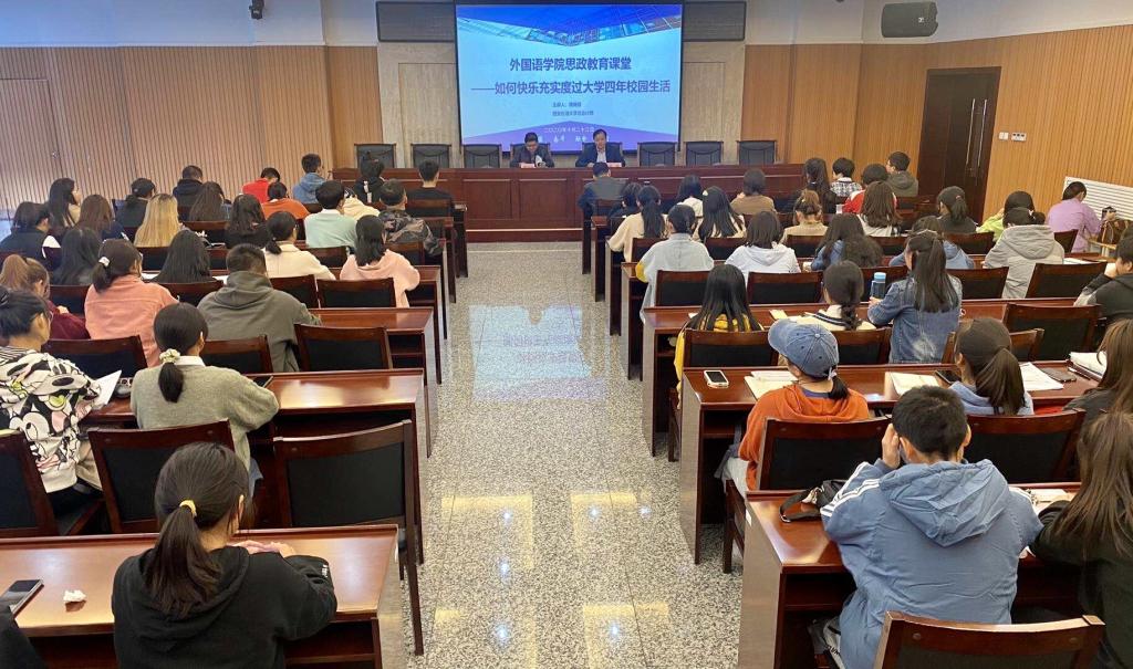 10月23日下午,校領導樊曉民總會計師在鄠邑校區圖書館第一會議室以“如何快樂充實度過大學四年校園生活”為主題,為外國語學院師生上了一堂生動活潑、精彩紛呈的專題思想政治教育課。學院全體學生工作干部、2019級和2020級主要學生干部聆聽了報告。報告會由外國語學院黨委書記蔡強主持。