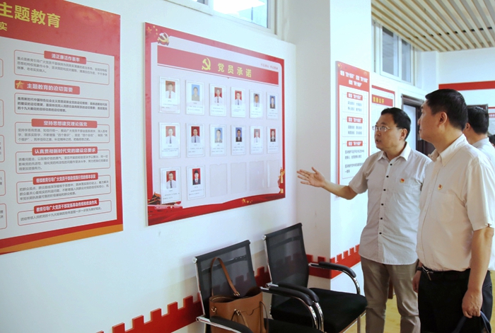 會前,評估驗收工作組一行前往地球科學與工程學院黨員活動室,對我校“雙創”建設單位的黨建陣地、成果展示和資料匯編進行了實地查看,并觀看了示范點建設微視頻。