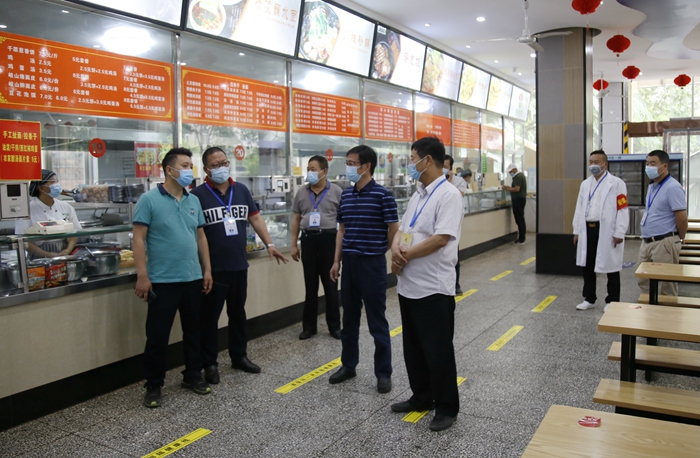 5月27日上午,由雁塔區教育局鄒轉景、張永剛,雁塔區市場監督管理局衛春濤,雁塔區衛健局王階昌,雁塔區疾控中心楊琪組成的雁塔區教育機構疫情防控第五巡回檢查指導組一行五人來到我校雁塔校區實地檢查疫情防控工作。副校長蘇文甫及相關部門負責人陪同檢查。
