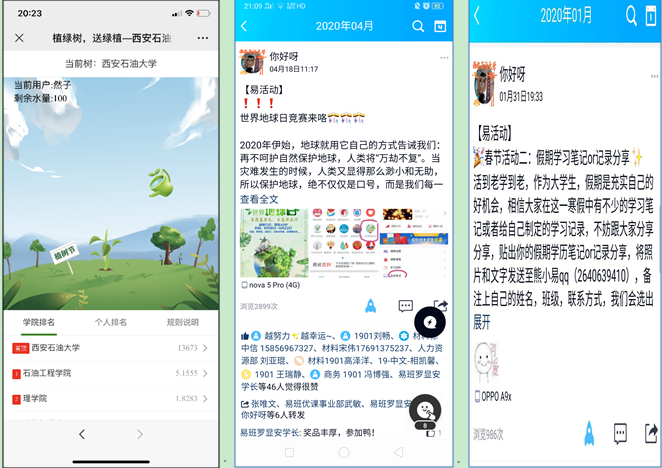寒假至今,校易班發展中心累計開展線上活動9次,圍繞防疫教育和中國加油等主題,扎實開展正能量特色活動。通過開發易班輕應用,獨創“植樹節為學校云植樹”的愛校榮校活動,日參與量近千人,截至目前參與總人數過萬人。通過此類活動,進一步增強了學生的集體榮譽感,提升了學生參與網絡思政活動的主動性,也為我校今后持續開展網絡思政育人工作積累了寶貴經驗。