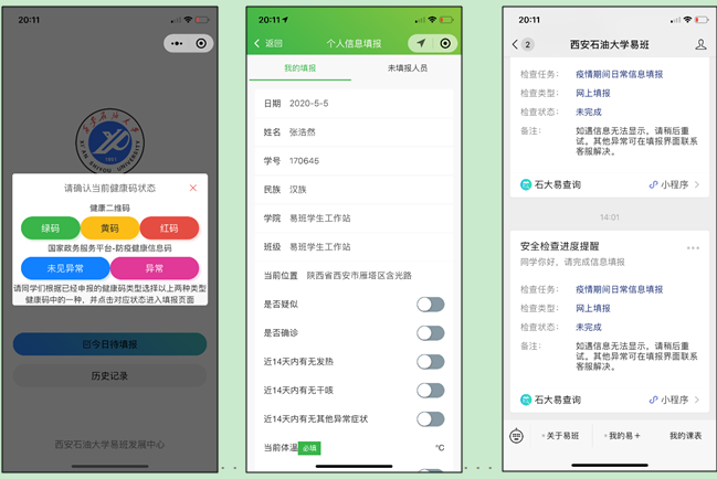 西安石油大學易班微信服務號在抗疫期間開發設置了通知提醒功能,除每日自動提醒學生及時打卡填報信息外,會將學校重要通知和其他內容定向發送給關注用戶或學生。5月1日晚發布學校返校通知后,在半小時內閱讀人數突破兩萬人次,成為學校通知覆蓋面最廣、閱讀人數最多、獲取信息最快的網絡渠道之一。