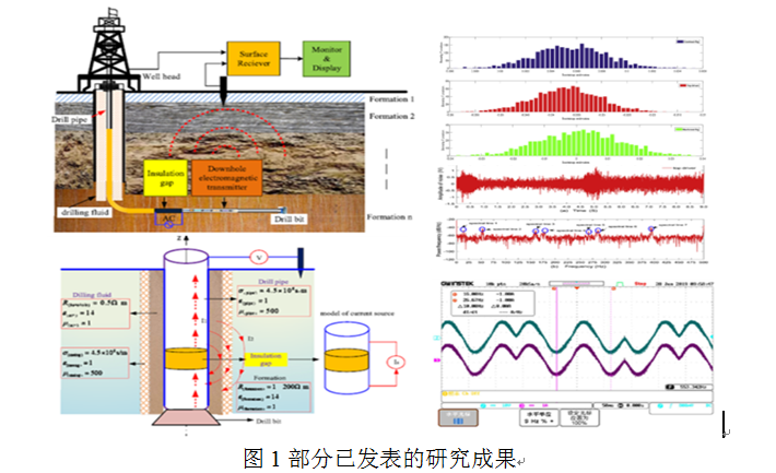 針對上述關鍵問題,劉科滿教授課題組開展了井下電磁發射技術、地面信號接收處理技術、井場噪聲處理技術等研究領域的科技攻關,圖1為部分已發表的研究成果。其中,課題組研制的井場噪聲采集、分析與評估系統,利用Bootstrap方法和Welch方法評估了不同鉆井工藝、不同鉆機、不同鉆進狀態時的井場的噪聲統計特性,為進一步認知井場噪聲的統計規律,建立噪聲分布模型奠定了良好的理論基礎,也為改進、優化電磁隨鉆測量、近鉆頭隨鉆測量、隨鉆地震勘探等測量儀器提供了重要的理論支撐。課題組研究獲得國家自然基金(面上)項目和陜西省科技攻關項目的資助。