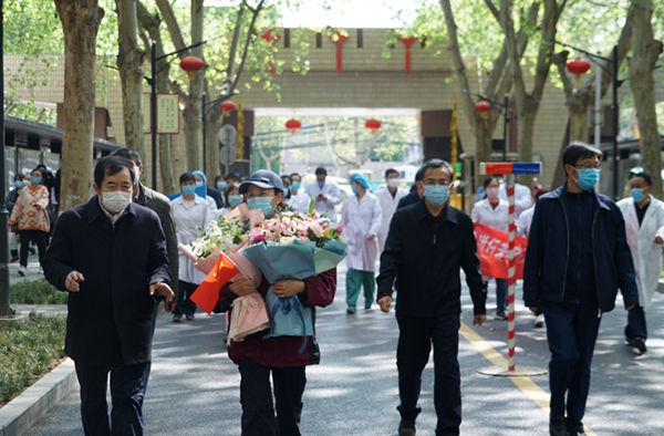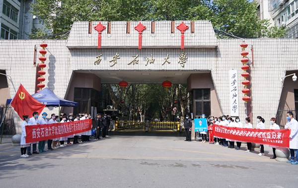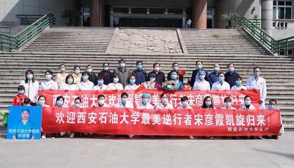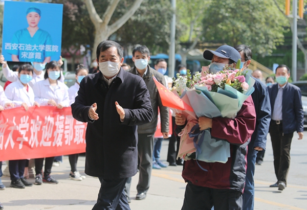4月8日上午,宋彥霞護士結束了14天的隔離觀察期,從隔離觀察點返回學校。校黨政領導李天太、張木、蘇文甫,相關部門負責人及校醫院部分職工在雁塔校區東門迎接宋彥霞護士。
