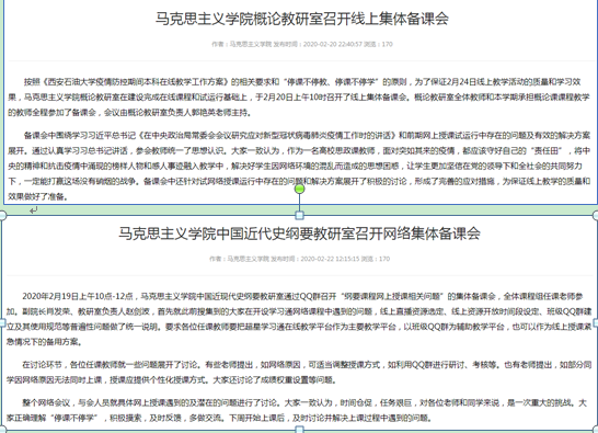 集思廣益,貫徹落實集體備課制度,提升課程內涵建設。學院和教研室精心組織,圍繞如何開展線上教學及慕課教學資源選用、如何分工建設在線課程、線上教學總結及改進、實踐教學方案等主題開展集體備課。組織教師認真學習教育部防疫思政大課、習近平總書記給北大援鄂醫療隊“90后”隊員回信并展開熱烈討論,并將我校援鄂醫療隊隊員我校宋彥霞護士的事跡在師生中廣泛宣傳,激勵廣大師生從我做起、為抗疫貢獻力量。把疫情防控素材很好地融入教學內容,用身邊感人事跡做好對師生的思想政治教育,切實提升了思政課的內涵建設。