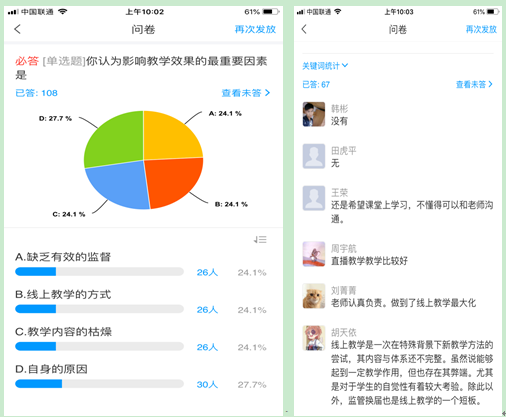 示范引領,充分發揮模范帶頭作用,強化師資隊伍建設。要確保在線教學質量,就必須有高素質教師隊伍,更需要先進模范發揮帶頭作用。即將退休的韓毅老師讓我們多次領略了共產黨員的風采,他潛心摸索教學平臺諸多功能的使用技法并通過手機錄屏功能制作成教程供大家學習,并且在課程群及時分享自己的思考和體會,激勵青年教師潛心教學;郭艷英和左玲兩位教學能手,在集體備課中多次為大家分享自己教學全過程的經驗和心得;這學期沒課且身在浙江農村的張瑞元老師也熱心投入在線課程的建設工作,主動分擔任務、聯絡人員。