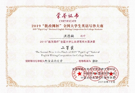 近日,2019“批改網杯”全國大學生英語寫作大賽決賽結果揭曉,我校共有三位同學獲獎,其中,我校洪德楠同學獲得全國二等獎,皮豫琳和汪佳馨兩位同學獲得全國三等獎。