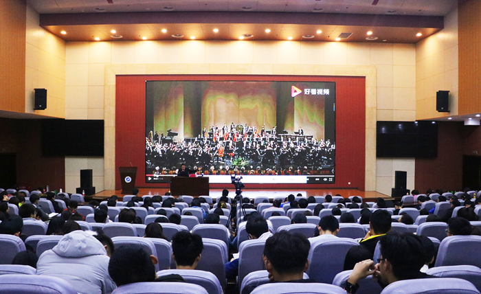 高賀杰老師以一幅圖為引,延伸到聲音。他指出,聲音是傳遞信息的一種基本方式,聲音延伸出音樂,“聰,耳聞而循心通上”,聰(聽)是一個人智慧的標志。隨后,高老師列舉不同領域名家實例詮釋音樂,并為同學們闡釋了怎樣聽音樂以及聽音樂的禮儀。他強調,音樂是需要想象力的,因為音樂的無造型性、無語義性,所以聽聲聯想畫面能更深層次的體會其內涵。最后,高老師為同學們播放并解析著名音樂家柴科夫斯基的《1812序曲》,使同學們感受到交響樂的魅力。
