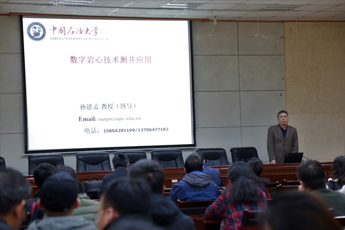 聘任儀式結束后,中國石油大學(華東)孫建孟教授以“數字巖心技術在測井中的應用”為題,在第三會議室為我校師生作了學術報告。孫建孟教授從數字巖心建模、巖石物理屬性模擬等方面對數字巖心技術進行了介紹,指出數字巖心技術與常規巖石物理實驗相比存在的優勢,是研究微觀因素對巖石物理屬性影響的重要手段,同時展望了數字巖心技術在地質、地震、巖土工程等學科中的應用前景。