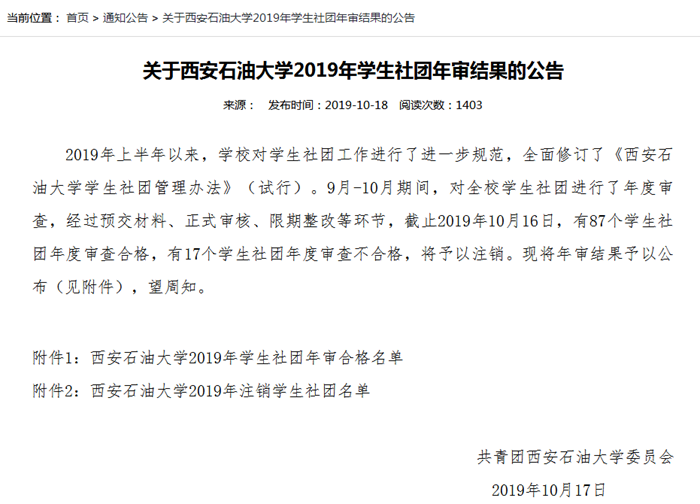 按照優化結構、提升效能原則,推動學生會、學生社團機構改革。明確學生會“服務師生,當好橋梁”定位,通過合并優化,突出服務職能,減少校級學生會工作部門2個,比上屆減少學生干部數量100余人,先后指導學生會、研究生會落實《學生會研究生會干部自律公約》,加強對學生干部的日常教育管理;在校團委成立社團管理部,強化對學生社團的指導和監督,9月份修訂發布《西安石油大學學生社團管理辦法(試行)》,10月份對年審不通過且整改不合格的17個學生社團予以注銷。