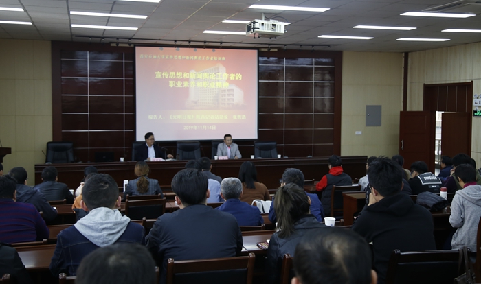11月14日下午,黨委宣傳部在雁塔校區第五會議室舉辦了宣傳思想和新聞輿論工作者培訓班,邀請《光明日報》陜西記者站站長、西北大學兼職教授張哲浩老師來校作報告。校黨委委員、宣傳部部長李國武主持報告會。各院系級單位黨組織、機關黨委各黨總支、各教工黨支部的宣傳委員,各院系教工通訊員,宣傳部全體工作人員共100余人參加報告會。