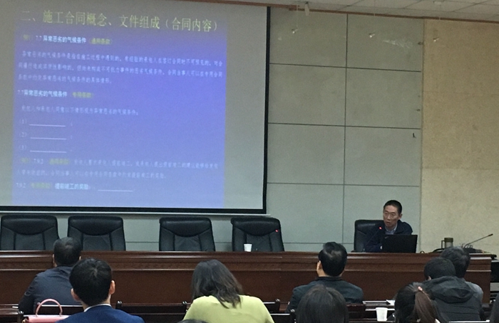 專題講座上,徐雷教授圍繞建筑工程合同管理中的合同概述、施工合同概念文件組成、施工合同的特點、施工合同風險識別障礙、施工合同索賠問題以及施工合同管理方法建議等六個方面,進行了詳細地講解。講座中穿插了大量的實際案例,具有較強的針對性和實踐性。講座結束后與會人員積極向徐教授提問請教,現場氣氛熱烈。