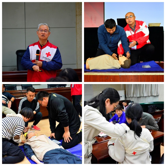 本次培訓共分兩批次進行,得到了各院(系)110余名教師的積極響應。來自陜西省紅十字會的5位救護員培訓師結合工作實際與現場救護案例,對紅十字理念、救護新概念、心肺復蘇術(CPR)、自動體外除顫儀(AED)、四項急救基本技能(止血、包扎、骨折固定及搬運)、常見急癥、意外傷害等急救知識進行理論講授與示范操作。