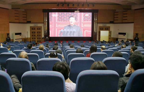 習近平主席的講話句句鏗鏘,直抵人心,“沒有任何力量能夠撼動我們偉大祖國的地位,沒有任何力量能夠阻擋中國人民和中華民族的前進步伐”,“中國的昨天已經寫在人類的史冊上,中國的今天正在億萬人民手中創造,中國的明天必將更加美好。”“不忘初心、牢記使命,繼續把我們的人民共和國鞏固好、發展好,繼續為實現‘兩個一百年'奮斗目標、實現中華民族偉大復興的中國夢而努力奮斗!”等講話在師生中引起熱議。