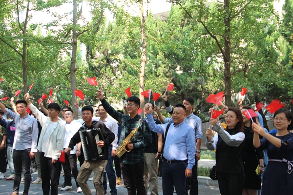 中午11時45分,音樂系100余名師生匯聚到雁塔校區學生餐廳門外。隨著聲樂教研室主任田立老師的現場伴奏,大家一邊揮舞著五星紅旗,一邊唱起了歌曲《我和我的祖國》《歌唱祖國》。這兩首慷慨激昂、振奮人心的經典紅色歌曲,表達了我校師生對祖國的崇敬和熱愛,展示了我校師生積極向上的精神風貌。師生們通過“快閃”這樣的新穎形式,唱響了共產黨好、社會主義好、改革開放好、偉大祖國好的主旋律,令人耳目一新,贏得了在場師生的陣陣掌聲。