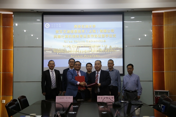9月29日下午,我校與印度安艾艾迪信息技術有限公司(NIIT)簽訂共建計算機相關本科專業正式合作協議。陳軍斌副校長和NIIT公司全球副總裁兼中國區總裁柯謀·杜博(Kamal Dhuper)分別代表學校和NIIT公司在合作協議上簽字。我校計算機學院、教務處、國際交流與合作處,以及NIIT公司中國區、西北地區負責人參加簽字儀式。