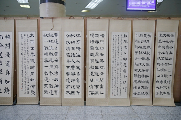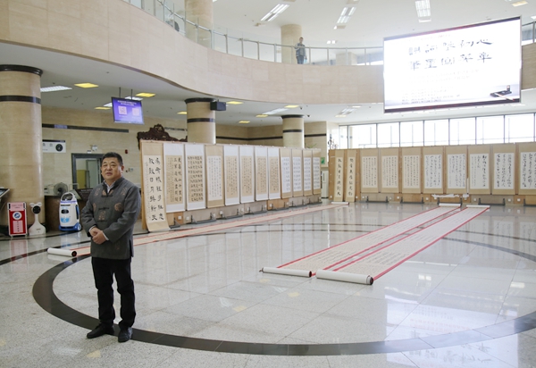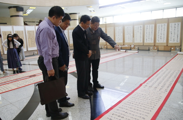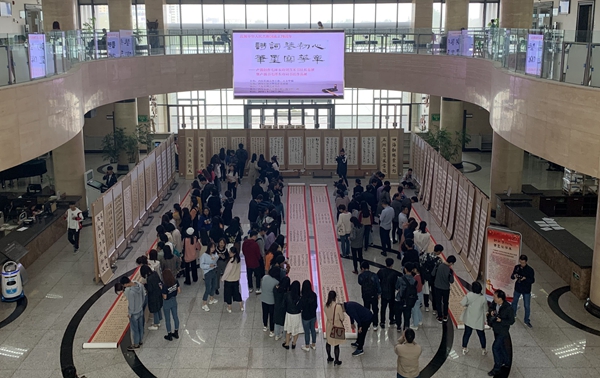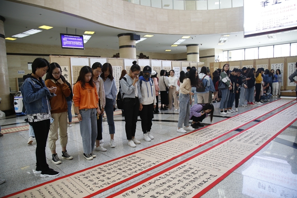 該展覽共展出人文學院教師盧強用一年時間創作完成的,以真、行、草、隸等多種書體書寫的毛澤東詩詞書法作品50余幅,內容豐富,形式多樣。其中,長130米、寬0.8米的書法長卷,以年代為序,精選了毛澤東1923年至1965年間各個時期的經典詩詞42首,以工穩的漢隸書寫,同時在每一首詩詞后以行書書寫個人的鑒賞學習體會,彰顯了毛澤東的心路歷程和人格魅力,深受在場師生的關注和好評。